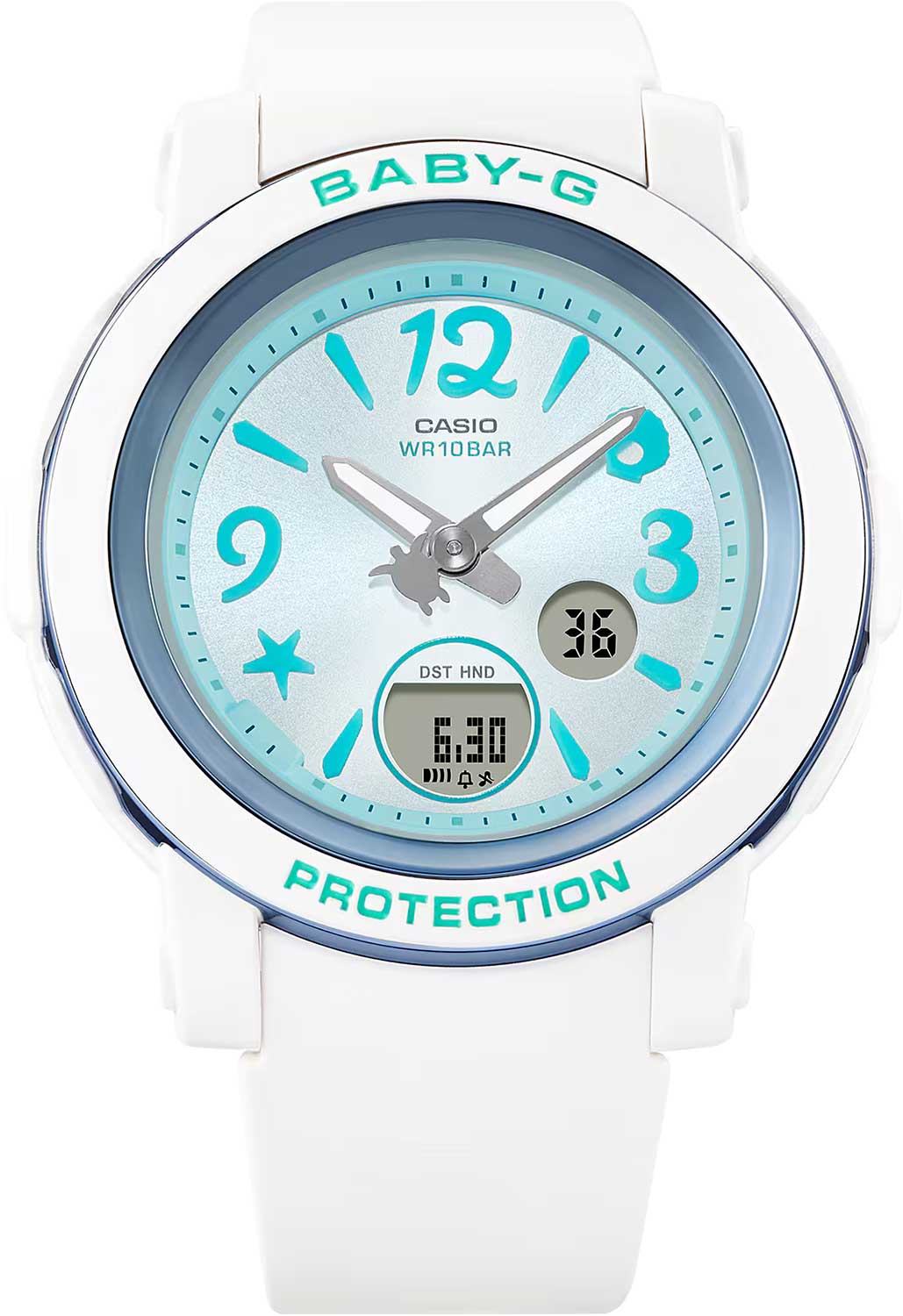 Эти яркие летние часики от Casio - отличный вариант как на каждый день, так и для занятий спортом.Baby-G. Женские часы, дизайн которых вдохновлен пляжами и подводным миром бескрайнего океана. Противоударный корпус защищает механизм от ударов и вибрации. Двойная подcветка: циферблат и ЖК-дисплеи подсвечиваются светодиодом, благодаря наличию функции задержки, после отпускания кнопки освещение горит еще несколько секунд. Настраиваемое послесвечение 1,5 или 3сек. Цвет подсветки: белый. Необритовое светонакопительное покрытие обеспечивает длительное послесвечение в темноте даже после кратковременного нахождения на свету. 12-ти и 24-х часовой формат времени. Секундомер с двумя точностями показаний: 1/100с (до 1ч) и 1с (после 1ч) и временем измерения 24ч. SPLIT-хронограф.Таймер обратного отсчета от 1мин до 24ч. Мировое время – 48 городов (31 часовой пояс), всемирное координированное время (UTC).