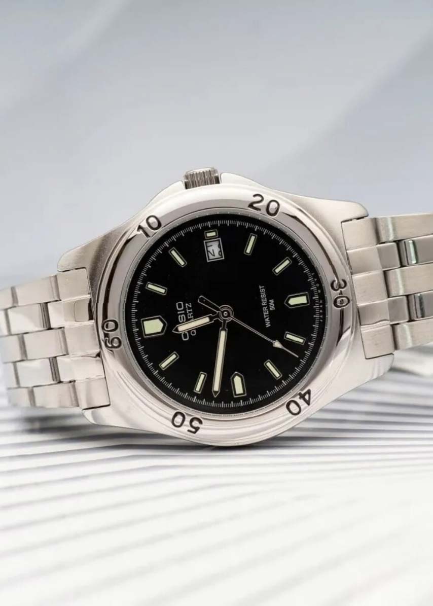 Standard. Мужские наручные часы. Круглый стальной корпус. Безель с минутной шкалой. Циферблат с метками в виде штрихов. Окошко даты находится в положении 3 часа. Рифленая заводная головка с защитой. Надежный стальной браслет с раскладывающейся застежкой.