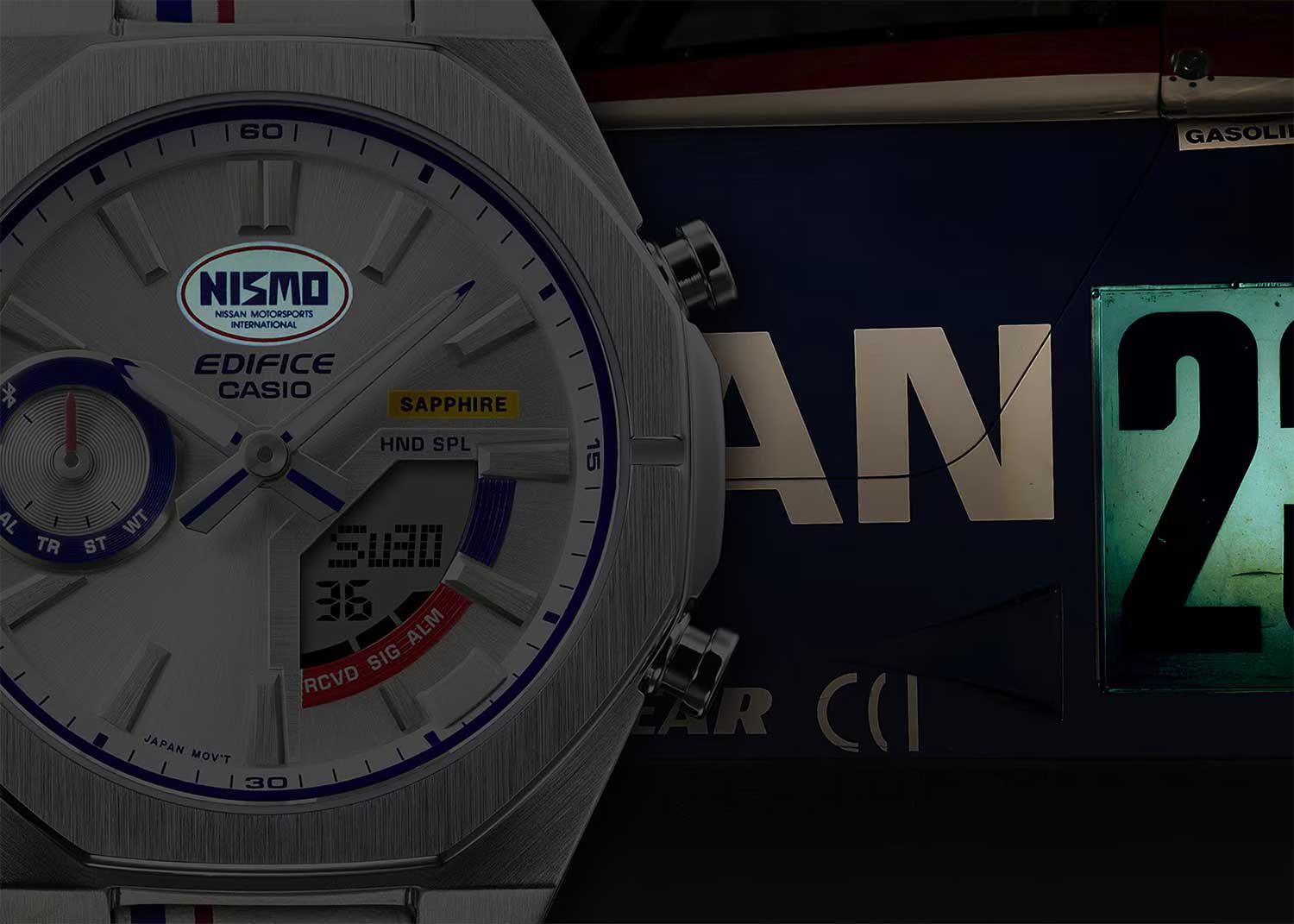 Edifice x Nismo. Мужские часы. Модель создана совместно с компанией Nismo, которая занимается автотюнингом и представляет интересы компании Nissan в автоспорте. Цветовая гамма часов вдохновлена логотипом Nismo, который использовался с 1984 по 1997 год. Красно-сине-белые цвета отсылают к легендарным гоночным машинам завода, таким как R91CP, принесшая японскому автопрому первую победу в «24 часах Дайтоны» в 1992 году.