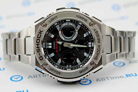 Часы новой серии G-Steel с усиленной ударопрочностью в стальном корпусе двухслойной конструкции для молодых и активных.G-Steel. Питание от солнечной энергии Tough Solar - солнечные батарейки большой мощности, индикатор заряда батареи. Функция автоматического сохранения энергии. Время работы аккумулятора без подзарядки приблизительно 7 месяцев, при включенной функции сохранения энергии приблизительно 18 месяцев. Противоударный корпус защищает механизм от ударов и вибрации. Ударопрочный двухслойный корпус - между слоями металла, в качестве амортизирующей прокладки, выступает полимер. Циферблат подсвечивается двумя светодиодами, при недостаточном освещении во время поворота запястья в сторону лица подсветка включается автоматически. Технология Multi Band 6 позволяет принимать сигналы от шести радиовышек, расположенных в различных точках земного шара, которые передают временные сигналы от определенных атомных часов. Коррекция текущего времени радиосигналом на территории почти всей Европы, США, Японии и Китая. Мировое время – 48 городов (31 часовой пояс), всемирное координированное время (UTC). Функция включения/отключения летнего времени. 12-ти и 24-х часовой формат времени. Секундомер с точностью показаний 1/100с и временем измерения 1ч. Сплит-хронограф.Таймер