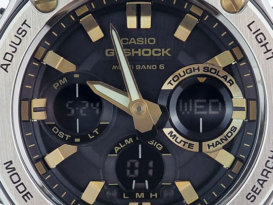 Часы новой серии G-Steel с усиленной ударопрочностью в стальном корпусе двухслойной конструкции для молодых и активных.G-Steel. Питание от солнечной энергии Tough Solar - солнечные батарейки большой мощности, индикатор заряда батареи. Функция автоматического сохранения энергии. Время работы аккумулятора без подзарядки приблизительно 7 месяцев, при включенной функции сохранения энергии приблизительно 18 месяцев. Противоударный корпус защищает механизм от ударов и вибрации. Ударопрочный двухслойный корпус - между слоями металла, в качестве амортизирующей прокладки, выступает полимер. Циферблат подсвечивается двумя светодиодами, при недостаточном освещении во время поворота запястья в сторону лица подсветка включается автоматически. Технология Multi Band 6 позволяет принимать сигналы от шести радиовышек, расположенных в различных точках земного шара, которые передают временные сигналы от определенных атомных часов. Коррекция текущего времени радиосигналом на территории почти всей Европы, США, Японии и Китая. Мировое время – 48 городов (31 часовой пояс), всемирное координированное время (UTC). Функция включения/отключения летнего времени. 12-ти и 24-х часовой формат времени. Секундомер с точностью показаний 1/100с и временем измерения 1ч. Сплит-хронограф.Таймер