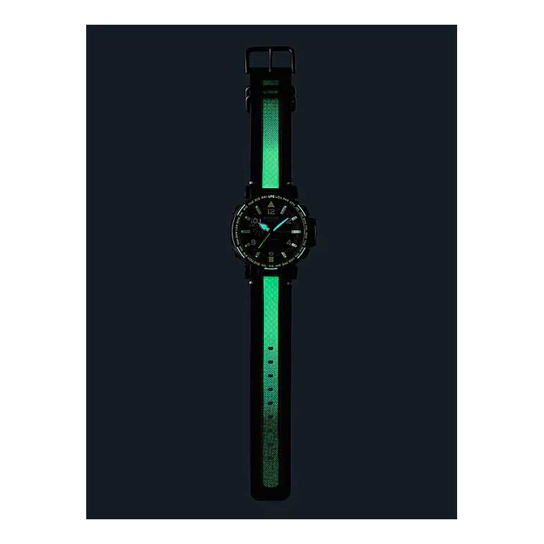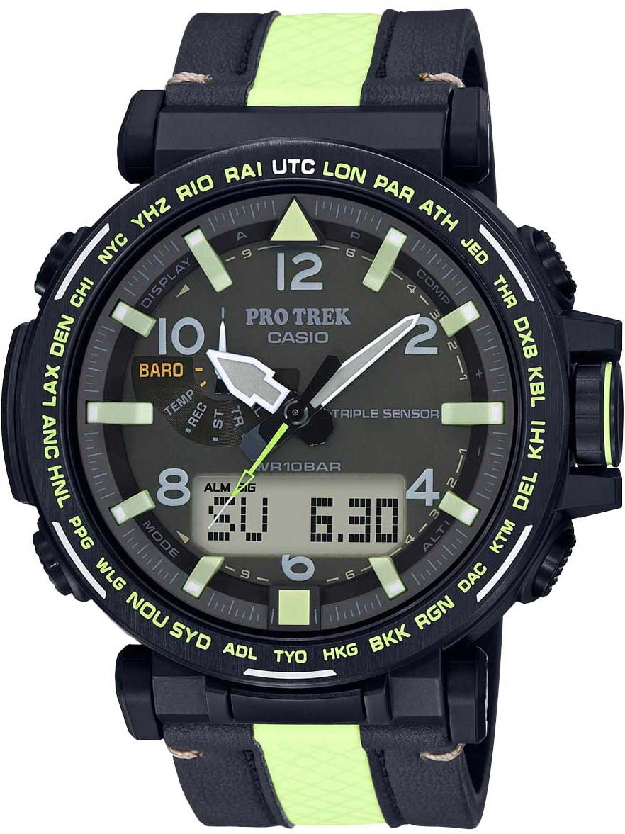 Часы, созданные для любителей активного ночного отдыха, сочетают в себе самые продвинутые технические характеристики в привлекательном внешнем виде.Pro Trek. Питание от солнечной энергии Tough Solar - солнечные батарейки большой мощности, индикатор заряда батареи. Функция автоматического сохранения энергии. Время работы аккумулятора без подзарядки приблизительно 7 месяцев, при включенной функции сохранения энергии приблизительно 25 месяцев. Модуль часов рассчитан на работу при низких температурах до -10°С/14°F. Двойная подcветка: лицо и циферблат подсвечиваются светодиодом, благодаря наличию функции задержки, после отпускания кнопки освещение горит еще несколько секунд. Цвет подсветки: белый. Необритовое светонакопительное покрытие обеспечивает длительное послесвечение в темноте даже после кратковременного нахождения на свету. Функция автоматической коррекции положения стрелок проверяет положение стрелок каждый час и корректирует его в случае необходимости. Мировое время – 29 городов (29 часовых поясов), всемирное координированное время (UTC). Функция включения/отключения летнего времени. 12-ти и 24-х часовой формат времени. Технология Triple Sensor позволяет точно и легко определять сторону света, температуру и атмосферное давление. Термометр от -10° до +60°С с точностью 0,1°C. Барометр - измерение атмосферного давления от 260 до 1100 гПа (от 195 до 825 мм рт. ст.). Встроенный цифровой компас. Диапазон измерения от 0° до 359° с точностью 1°. Высотомер - встроенный датчик барометрического давления с возможностью вывода результатов в единицах высоты над уровнем моря (от -700 до 10000 метров). График набора высоты. Хранение до 30 записей о высотных точках рельефа местности - измеренной абсолютной высоты, даты и времени. Система Smart Access с помощью электронной заводной головки обеспечивает простой и удобный доступ ко всем важным функциям часов. Нажатие или поворот заводной головки позволяет переключаться между различными режимами и активировать будильник, таймер, секундомер, а также настраивать функцию мирового времени. SPLIT-хронограф. Секундомер с точностью показаний 1/100с и временем измерения 24ч. Таймер