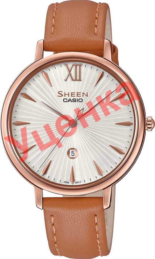 Sheen. Ультратонкие женские часы. Циферблат выполнен по технологии Sunray (солнечные лучи). Метки в виде штрихов. Окошко даты находится в положении 6 часов. Кожаный ремешок с классической застежкой.