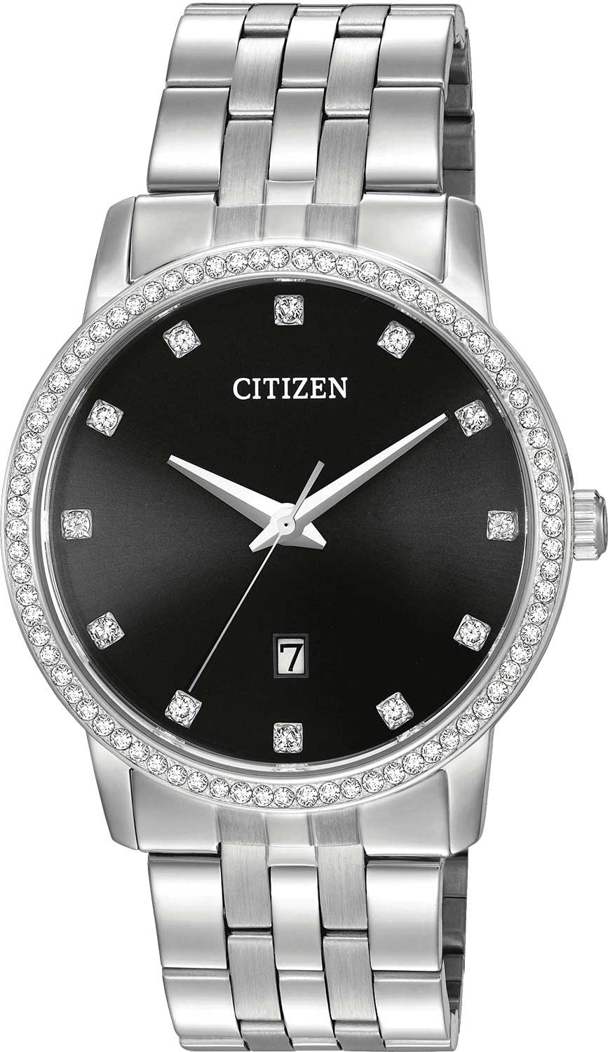Часы с круглым стальным корпусом. Циферблат выполнен по технологии Sunray (солнечные лучи). Метки в виде точек, инкрустированных кристаллами. Окошко даты находится в положении 6 часов. Браслет с раскладывающейся застежкой.