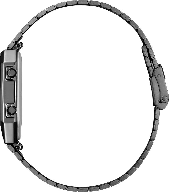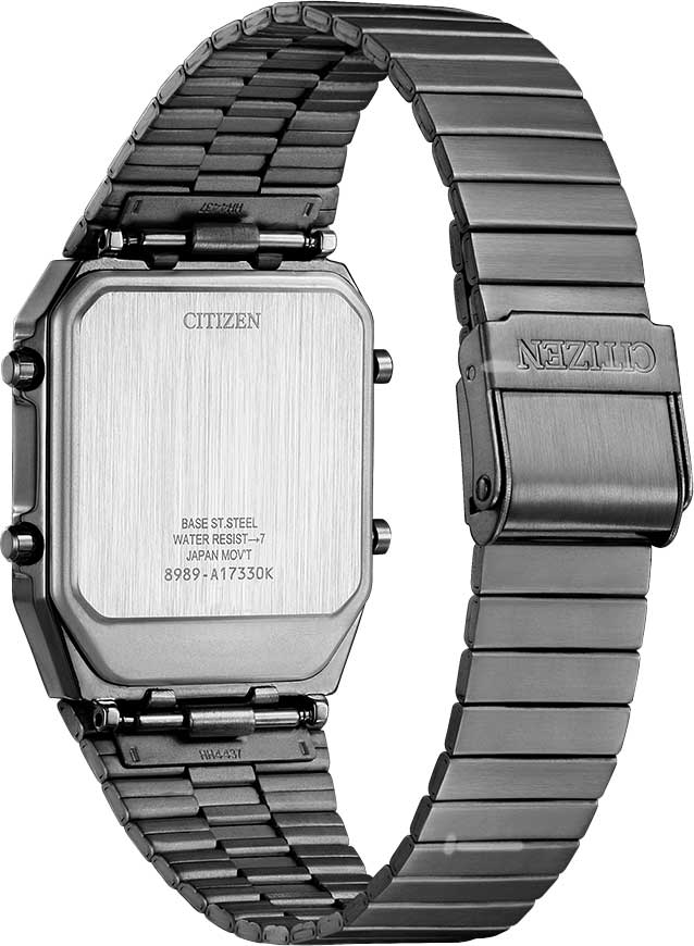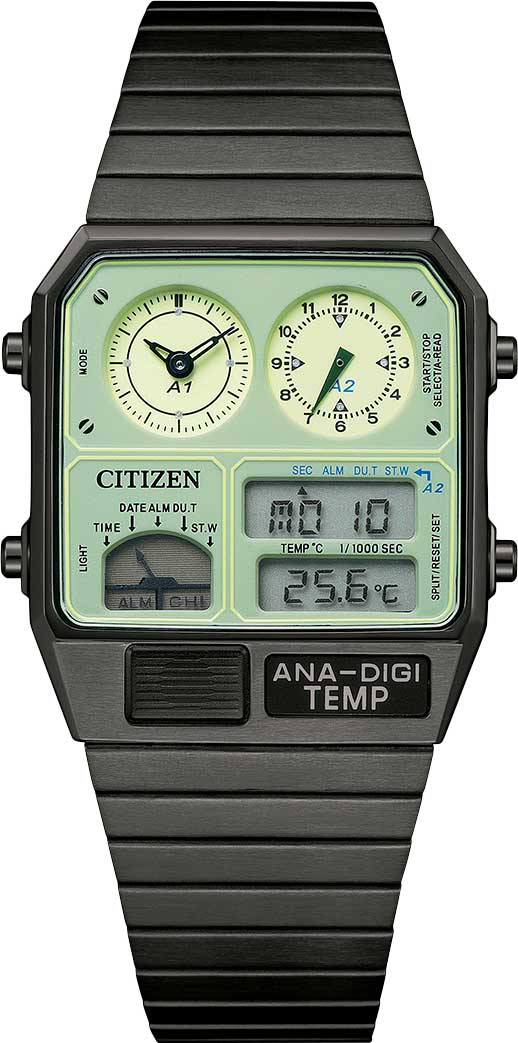 Кварцевые часы не требуют особого ухода и обеспечивают надежное хранение времени. Потребляя мало энергии, они избавляют от необходимости постоянно заводить часы. Мужские наручные часы, вдохновленные аналогово-цифровыми часами Citizen 1980-х годов. Прямоугольный стальной корпус с минеральным стеклом. Второй часовой пояс. Секундомер с точностью 1/1000сек и временем измерения 12ч. SPLIT-хронограф. Дополнительный цифровой дисплей. Метки в виде арабских цифр и штрихов. Термометр. Браслет с регулируемой застежкой.