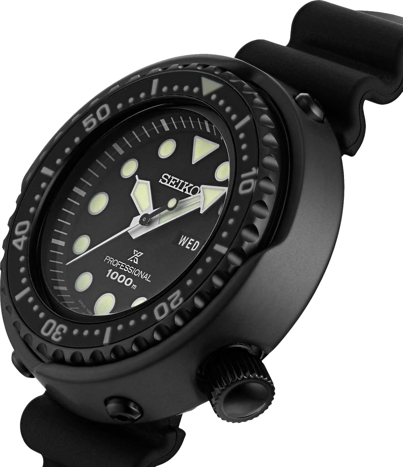 Prospex Sea. Мужские часы соответствуют стандартам ISO для подводного плавания. Модель отдает дань уважения часам дайверским часам Seiko 1975 года. В механизме 7 камней. Циферблат с метками в виде точек защищен прочным сапфировым стеклом. Стрелки и метки в виде штрихов с фирменным люминесцентным покрытием LumiBrite, которое светится в темноте после непродолжительной подзарядки на свету.