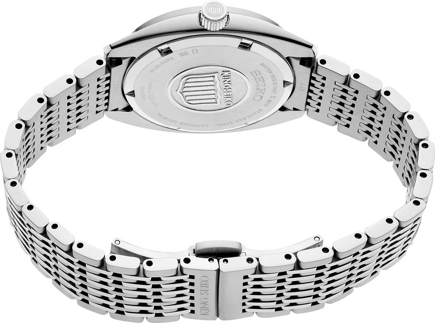 Завинчивающаяся задняя крышка украшена объемным логотипом King Seiko. Рифленая заводная головка. Индивидуальный серийный номер. Надежный стальной браслет с раскладывающейся застежкой.
