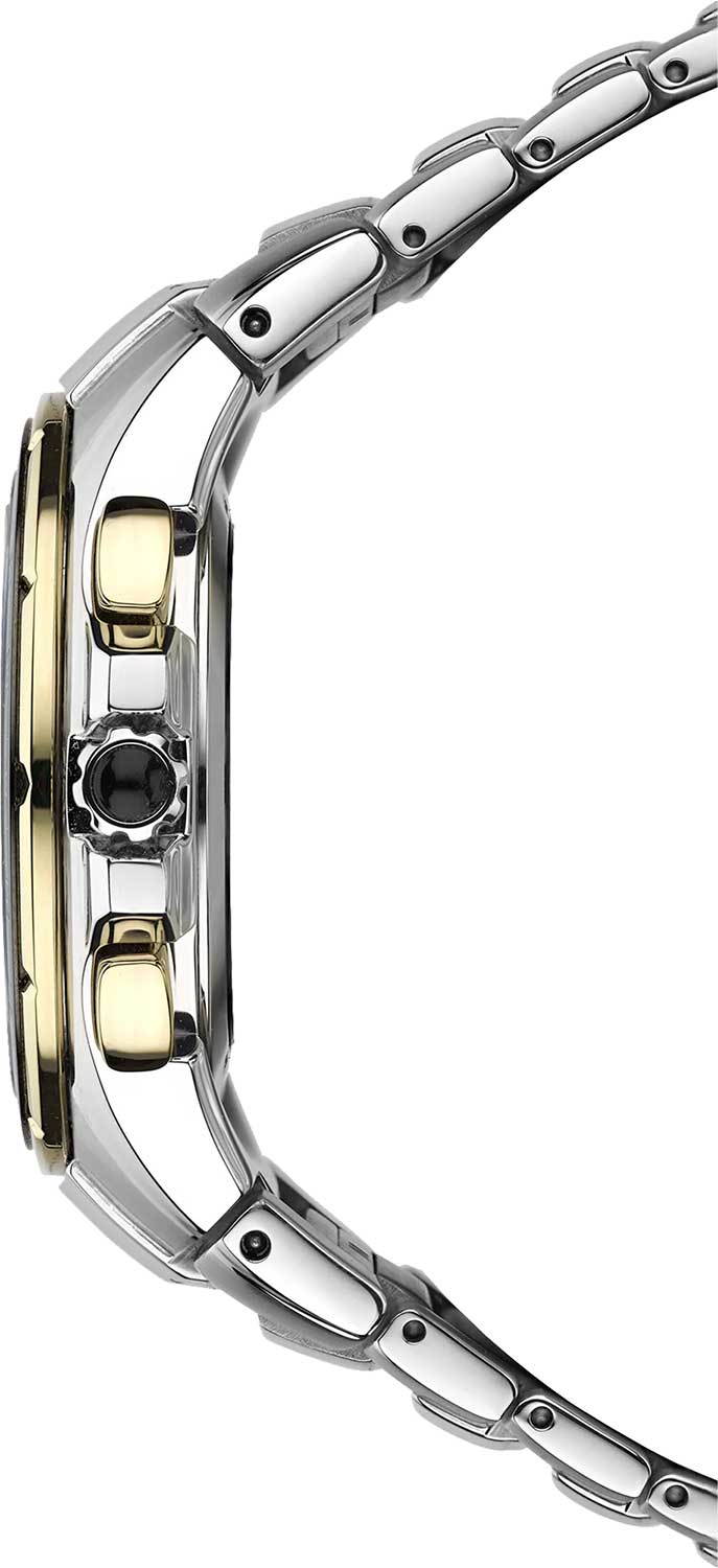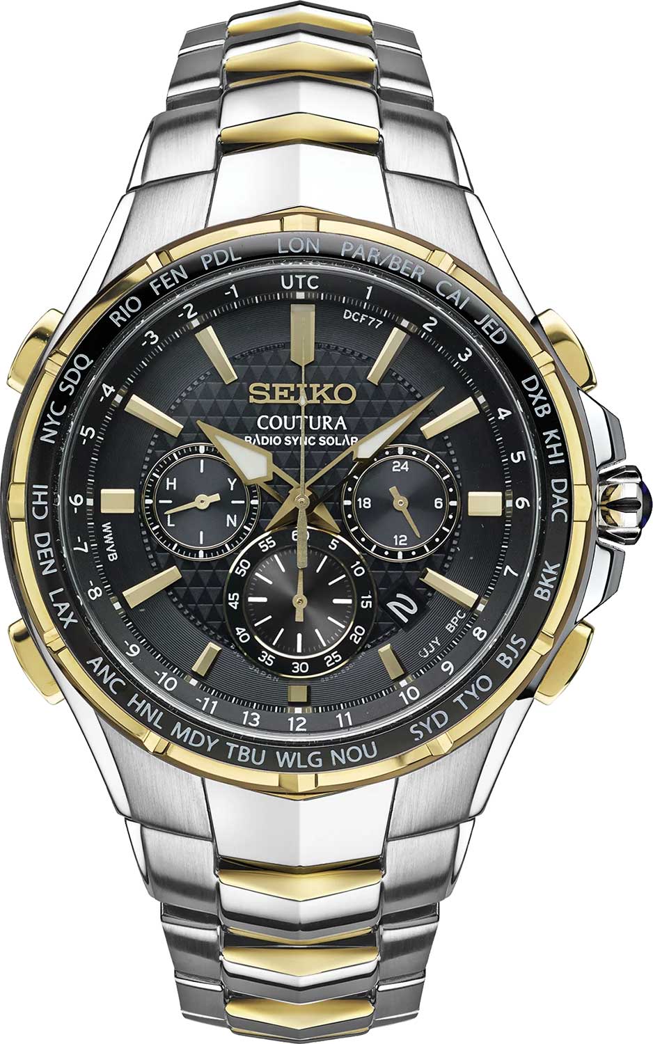 Coutura. В механизме 10 камней.Часы-хронограф с секундомером. Секундомер с точностью 1/5сек и временем измерения 1ч. Питание от солнечной энергии. Запас хода приблизительно 6 месяцев. Функция сохранения энергии. Запас хода при включенной функции сохранения энергии до 2 лет. Функции индикации заряда и предотвращения перезарядки. 12-ти и 24-х часовой формат времени. Коррекция текущего времени радиосигналом на территории Германии, Великобритании, Китая, США и Японии. Отображения результата приема сигнала. Функция автоматической настройки положения стрелок. Мировое время - 25 часовых поясов.