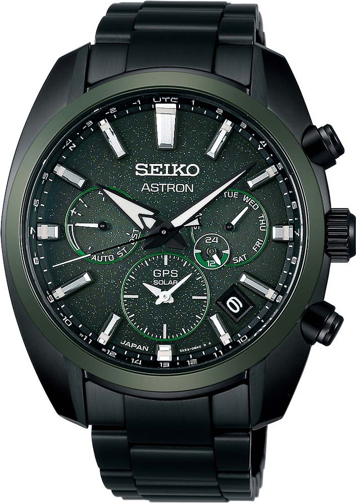 Astron GPS Solar. В механизме 12 камней. Часы со встроенным GPS-приемником определяют часовой пояс, дату и точное время. Цветовая гамма вдохновлена туманностями бескрайнего космоса. Питание от солнечной энергии, индикатор уровня зарядки батареи. Функция сохранения энергии. Запас хода при полной зарядке аккумулятора 6 месяцев, при включенной функции сохранения энергии - 2 года. Функция предотвращения перезарядки.