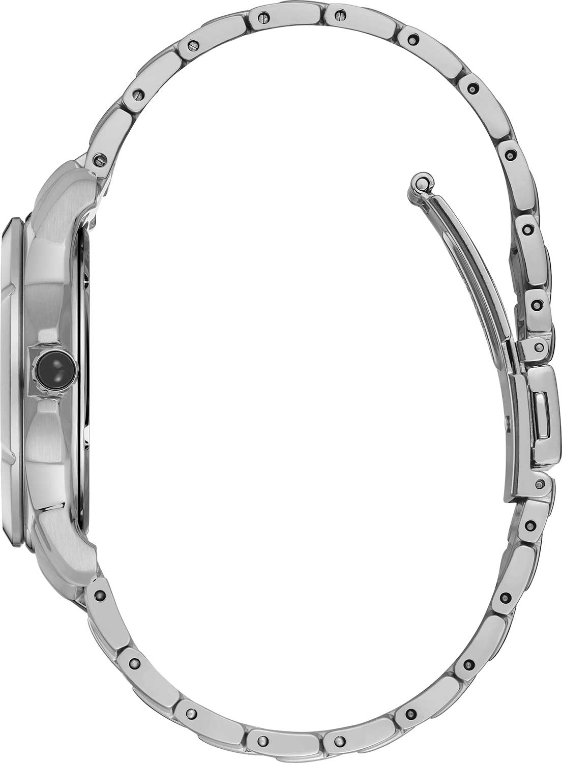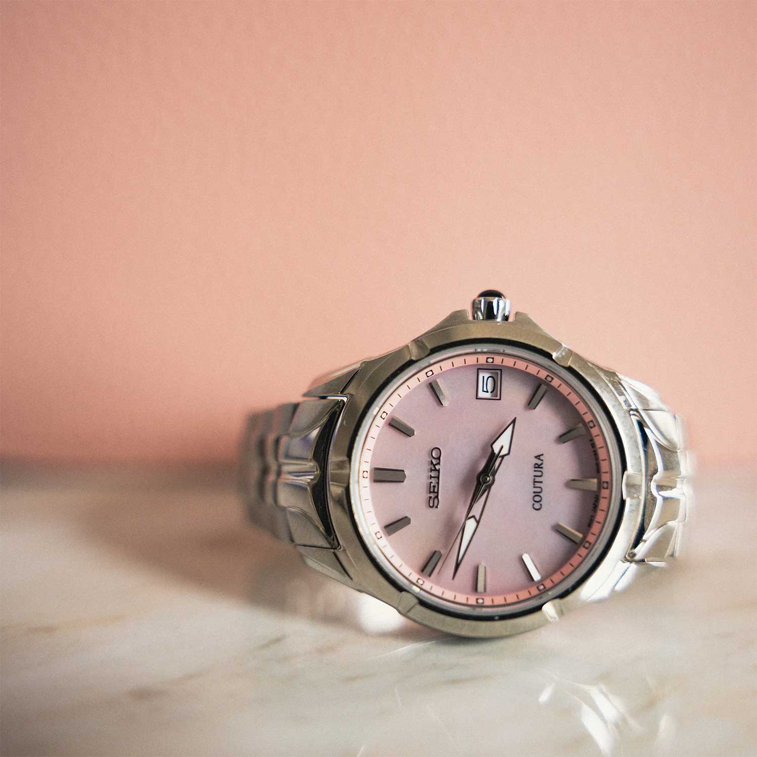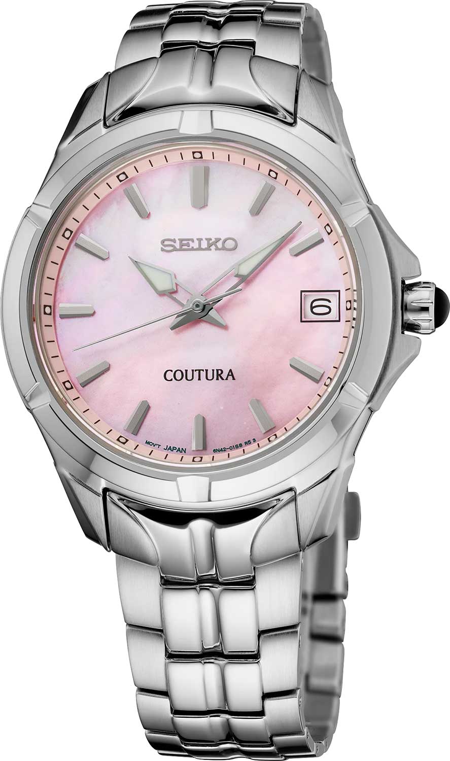 Coutura. Женские часы с круглым стальным корпусом. Перламутровый циферблат защищен прочным сапфировым стеклом. Накладные метки в виде штрихов. Стрелки и метки с фирменным люминесцентным покрытием LumiBrite, которое светится в темноте после непродолжительной подзарядки на свету. Окошко даты находится в положении 3 часа. Заводная головка с защитой украшена камнем в форме кабошона. Браслет с тройной раскладывающейся застежкой.