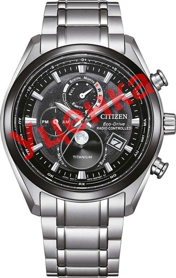 Tsuki-yomi AT. Мужские часы. Система Eco-Drive не требующая замены батарейки. Питание от солнечной энергии, запас энергии на 180 дней. Функции автоматического сохранения энергии, индикации заряда и предотвращения перезарядки. Защищены от магнитных полей. 12-ти и 24-х часовой формат времени. Автоматический прием сигналов от радиовышек, расположенных в различных точках земного шара, которые передают временные сигналы от определенных атомных часов. Коррекция текущего времени радиосигналом на территории почти всей Европы, США, Японии и Китая. Мировое время - 24 города, переход на зимнее и летнее время. Автоматический индикатор фаз Луны. Функция переключения отображения фаз Луны между северным и южным полушарием. Ручная калибровка фаз Луны. Текстурированный циферблат вдохновлен поверхностью луны и защищен прочным сапфировым стеклом. Метки в виде штрихов. Окошко даты находится в положении 4 часа. Ретроградный указатель дня недели. Браслет с раскладывающейся застежкой.